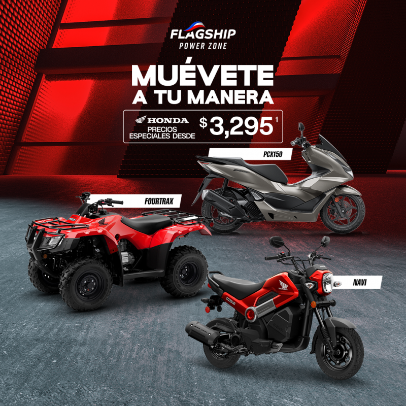 (1) Honda Navi 2024 Precio regular $3,495, menos bono de $200 para un precio especial $3,295. (2) Honda Pioneer 700 2025 con Precio de venta $21,995. (3) Honda FourTrax 420TM 2025 Precio regular $8,495, menos bono de $500 para un precio especial de $7,995.(4) Scooter Honda PCX150 2024 Precio regular $5,995, menos bono de $500 para un precio especial de $5,495.Ciertas restricciones aplican, más detalles en el dealer. Ofertas no pueden combinarse con otras ofertas y están sujetas a aprobación de crédito en caso de financiamiento. Ofertas no incluye gastos de originación, registro, casco, accesorios, mantenimiento, ACAA, ni ningún tipo de seguro. Esta oferta no incluye cualquier arancel, tasa, impuesto y/o tarifa aplicable al día de compra de la unidad. Productos sujetos a disponibilidad en nuestras facilidades de Flagship Power Zone 65, Flagship Power Zone Ponce y Flagship Power Zone Río Grande. Ofertas válidas del 1 de febrero de 2026 hasta el 28 de febrero de 2026.